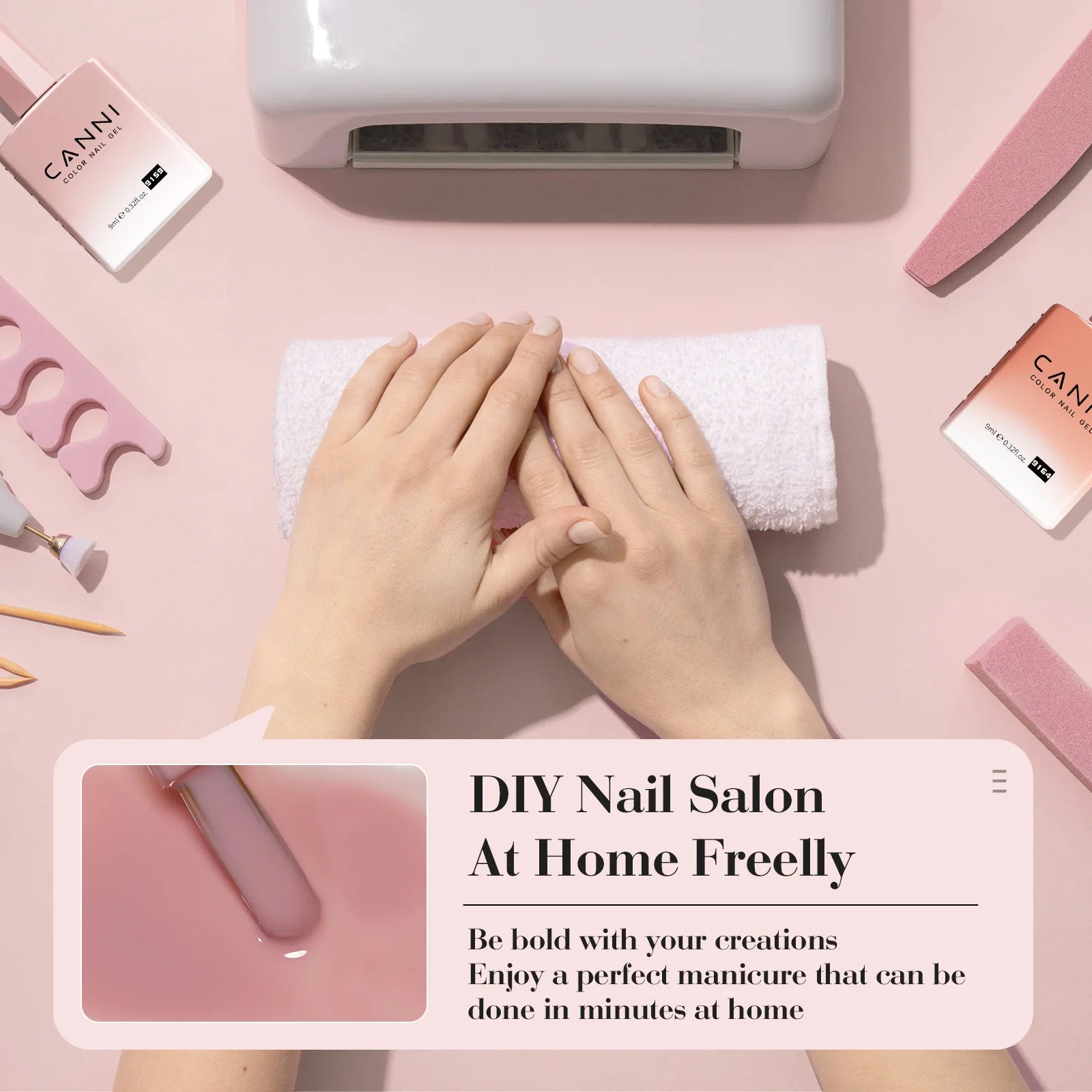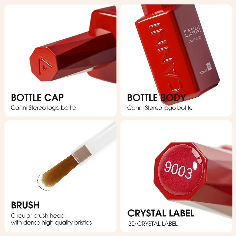 Contains a 9ml bottle of luxurious CANNI - branded HEMA/TPO FREE Gel Nail Polish. The bottle design combines fashion and art elements. The delicate brand logo is special and unique. It is not only easy to hold but also shows the quality and style in details, fully demonstrating the charm of high - end nail art products.